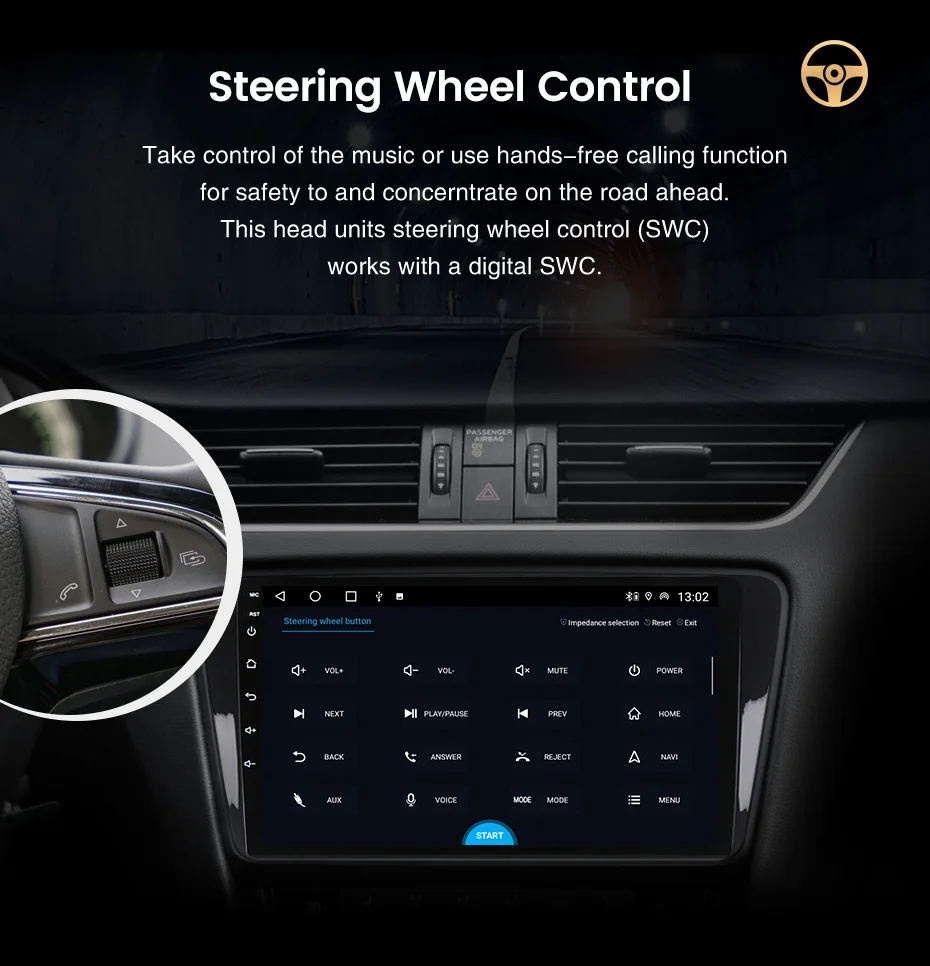 Управляйте музыкой или используйте функцию громкой связи для безопасности и увязывания на дороге вперед. Этот Головной блок управления рулевым колесом (SWC) работает с цифровым SWC.