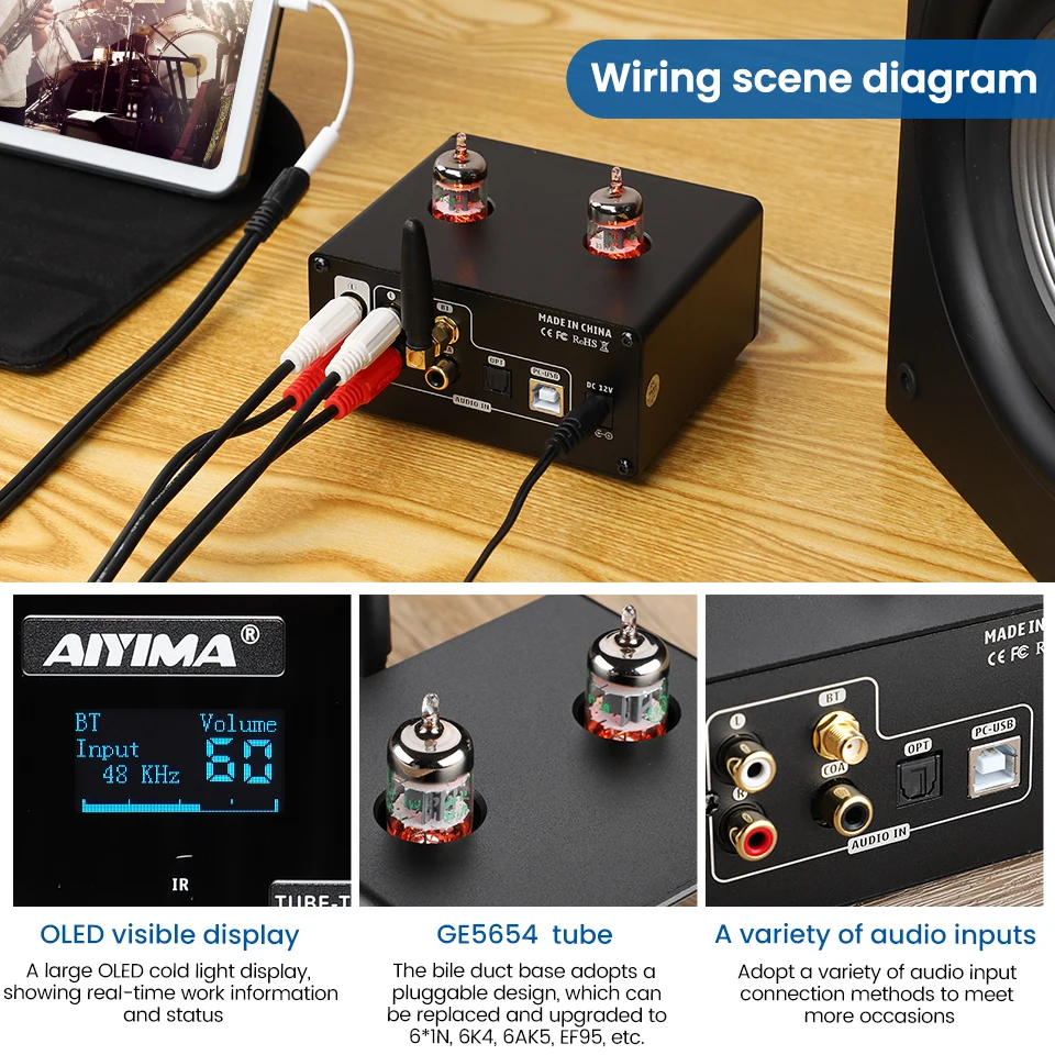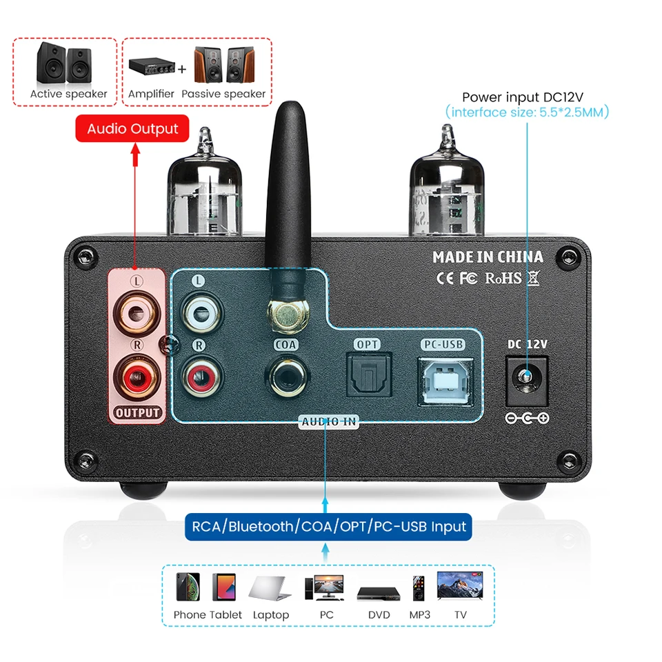 Tube-T10 Поддержка Bluetooth/PC-USB/COAX/OPT, он может совместим с большинством аудио оборудования на рынке.