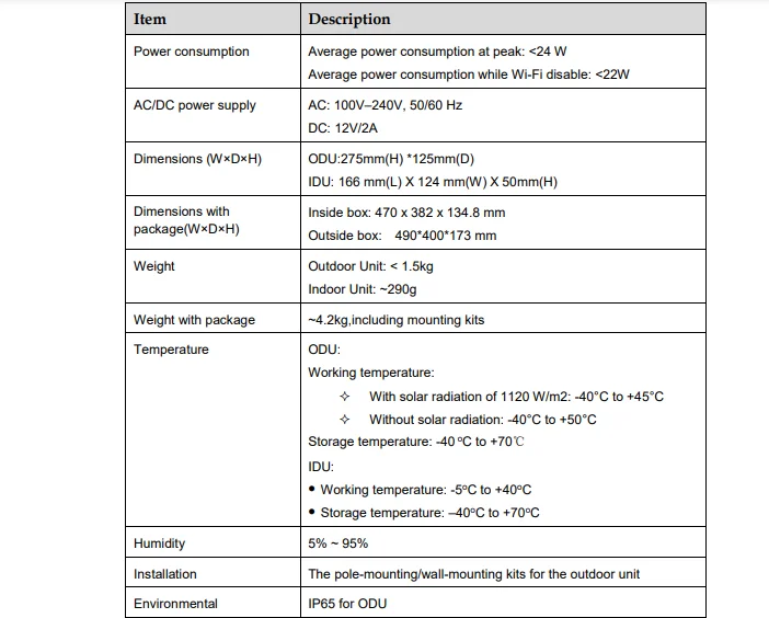 Блок питается от PoE, -66 моделей с парным IDU для обеспечения внутреннего покрытия WiFi и подключения gigabit Ethernet.