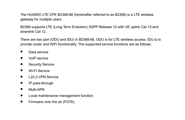 Huawei CPE B2368-это высокопроизводительная открытая активная антенна последнего поколения. B2368-это высокопроизводительный 4x4 MIMO модем, поддерживающий скорость передачи данных Cat-12 DL до 600 МБ/с./с.