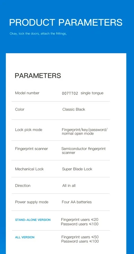 2. Fingerprint, password, mechanical key, APP (Bluetooth) 4 unlocking methods