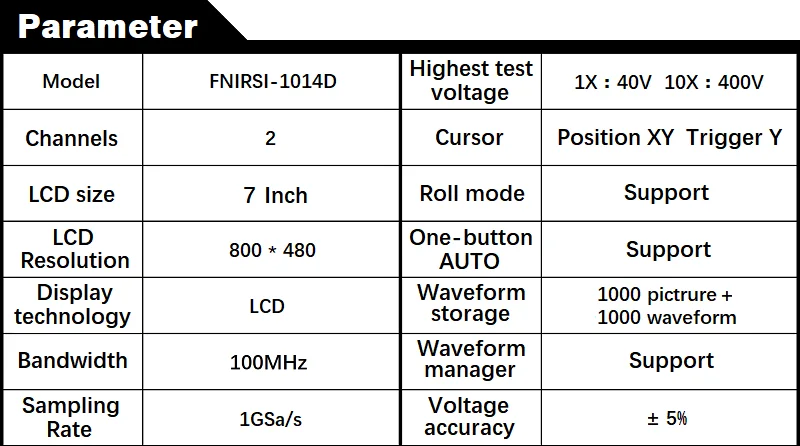 FNIRSI-1014D-это два в одном осциллографе и генератор сигналов, запущенный FNIRSI. Он имеет комплексные функции и высокую практичность. Это экономичный двухканальный Настольный осциллограф для индустрии технического обслуживания и НИОКР. Осциллограф имеет частоту дискретизации в реальном времени 1GSa / s и аналоговую пропускную способность 100 МГц * 2; Полная функция триггера (однократное/нормальное/автоматическое), как для периодического аналогового сигнала, так и для aperiodic цифрового сигнала может быть использован свободно; Встроенный генератор сигналов DDS и оригинальный выходной сигнал в отрасли (@ 2.5vpp), Все шаги частоты сигнала-1 Гц, поддержка 14 видов стандартного функционального сигнала и настраиваемого сигнала, измельчение выходного устройства захватывает часть или всю часть сложных сигналов, измеренных осциллографом как выходной сигнал генератора сигнала, который может хранить до 1000 индивидуальных сигналов отключения; Встроенный модуль защиты от высокого напряжения может выдерживать Непрерывное напряжение до 400 В, не беспокоясь о ДТП при сжигании осциллографа, вызванном тем, что датчик не перемещается на 10x шестерню. Большой режим горизонтальной прокрутки, который может контролировать медленные изменения уровня; Оснащен эффективной одной кнопкой авто, которая может отображать измеренную форму волны без утомительной регулировки; дисплей высокой четкости ЖК-дисплей с 7-дюймовым 800*480 разрешение; Курсором благодаря функции измерения, при ручном чтения амплитуду и частоту параметры, Не нужно считывать фоновые весы и количество, и не нужно конвертировать, чтобы напрямую Получить пик до пика и частоты, чрезвычайно удобная функция захвата экрана и хранения сигналов, встроенная память объемом 1 Гб, может хранить до 1000 фотографий с экрана + 1000 групп данных волноводной формы, Процесс хранения прост и быстр, сохранение текущей формы сигнала одним щелчком, отсутствие громоздких подсказок и выбор для сохранения текущих данных, очень удобный; Мощный менеджер изображений формы волны, поддержка просмотра эскизов, просмотр, просмотр подробной информации о функциях поворота страницы, удаления и увеличения формы волны, Уменьшение и перемещение удобны для вторичного анализа. Фюзеляж оснащен интерфейсом USB, который может быть подключен к компьютеру для реализации совместного использования собственных фотографий экрана и компьютера, что удобно для вторичного анализа; функция графического дисплея Li Shayu может использоваться для сравнения и определения амплитуды, частоты и фазы двух групп сигналов; Функция просмотра FFT может оценить гармонический компонент сигналов; Функция графического дисплея Li Shayu может использоваться для сравнения и определения амплитуды, частоты и фазы двух групп сигналов;