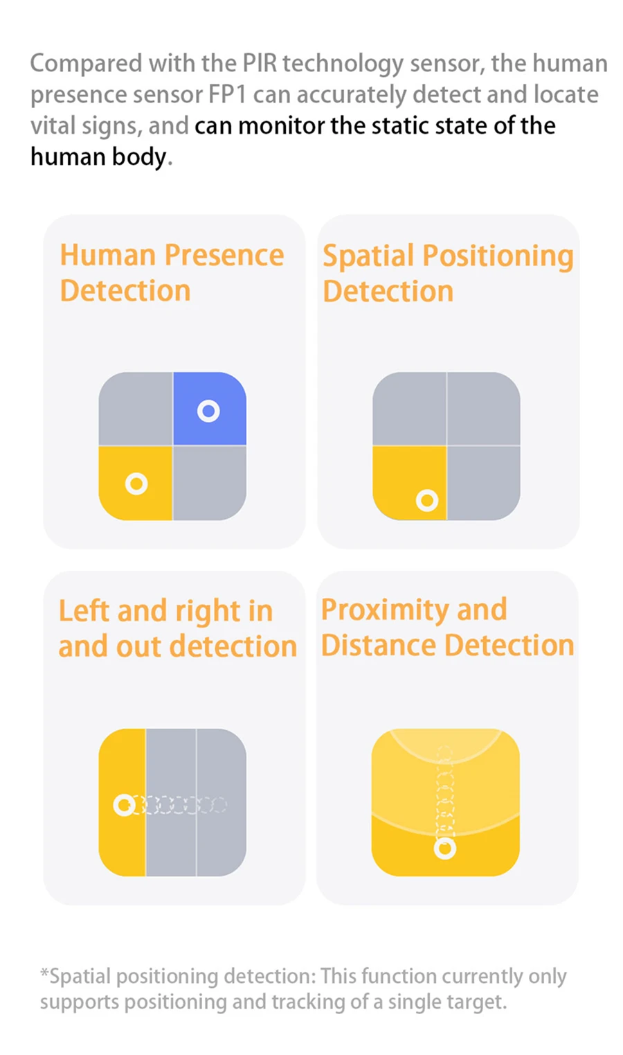 Датчик присутствия человека aqara FP1 с помощью миллиметровых волн может обнаруживать тонкие движения, разумно ощущать различные направления движения человека и близкие расстояния. Может не только обнаруживать статических людей, но и обнаруживать направление действий, расстояние близко и даже позиционирование пространства