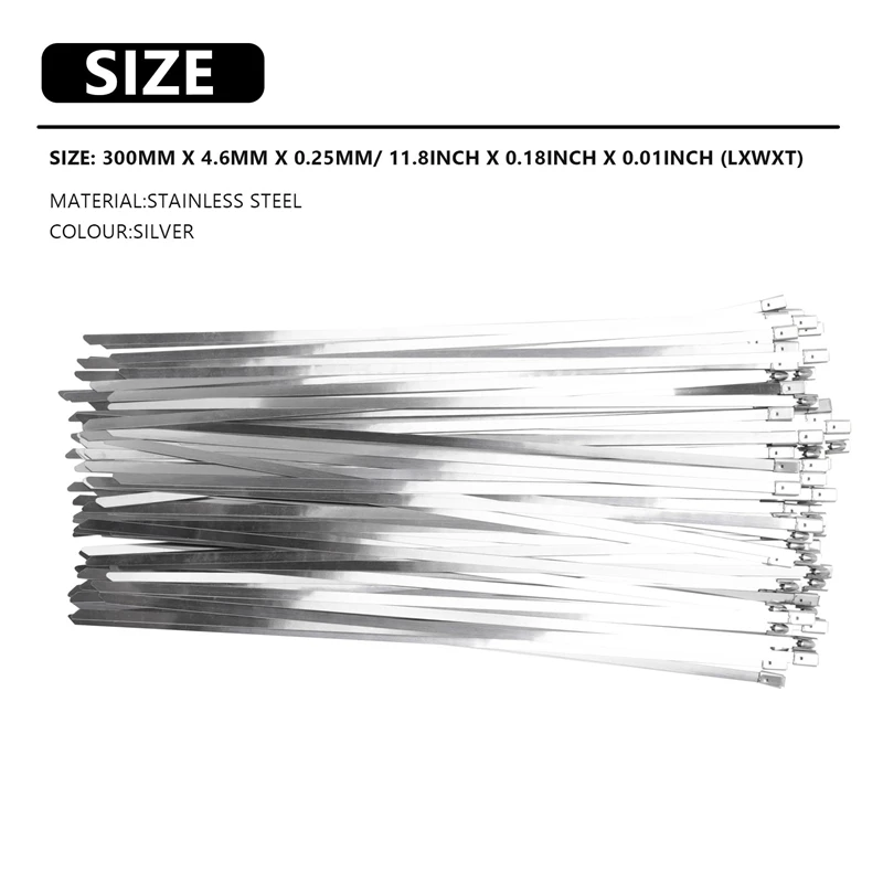 [С металлической застежкой-молнией Галстуки]: 100 шт. Металлические Кабельные стяжки тяжелый режим работы; Размеры: 300 мм x 4,6 мм x 0,25 мм/11,8 дюймов x 0,18 дюймов x 0,01 дюймов (LxWxT)