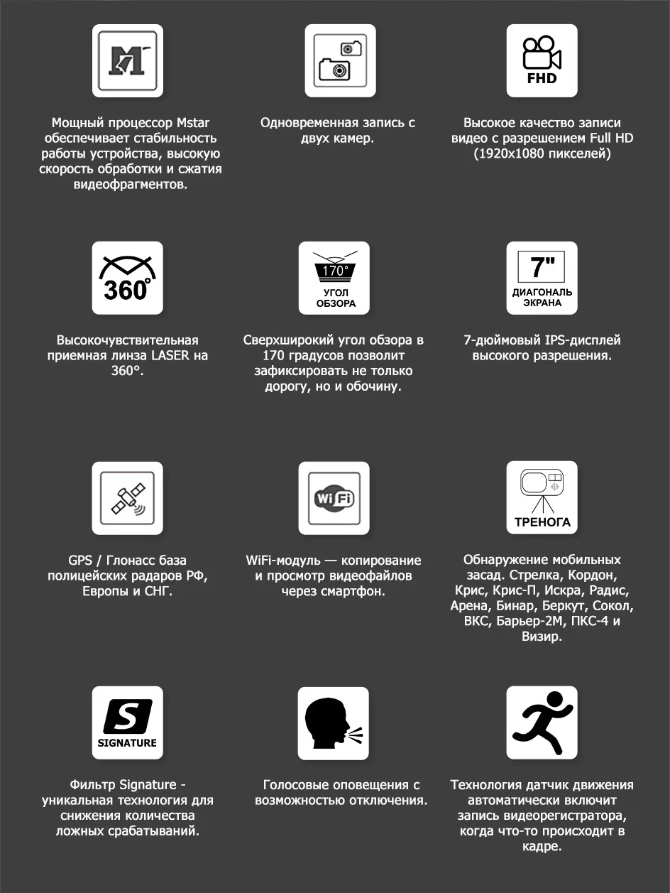 Новая сигнатурная технология Signature позволяет сократить ложные срабатывания от устройств и свести их до минимума, распознаёт по типу и названию большинство полицейских радаров.