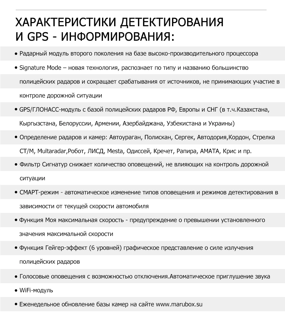 В GPS-модуль Marubox M680R интегрирована база данных координат полицейских радаров и их характеристики. Marubox M680R содержит информацию о радарах РФ, Европы, Белоруссии, Украины, Казахстана, Узбекистана, Азербайджана, Армении. Каждый месяц обновленные базы радаров доступны на сайте производителя.