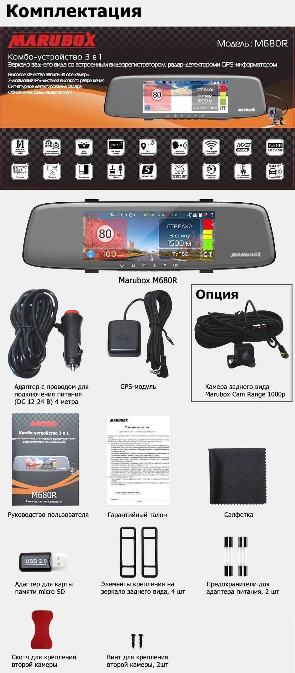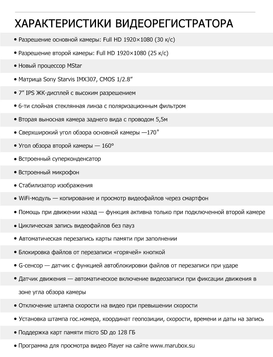 MARUBOX M680R создан для повышения комфорта и безопасности управления автомобилем. Комплектующие в сочетании с новейшими разработками в сегменте автомобильной электроники позволяют чувствовать себя уверенно на дороге, на дежно фиксировать все происходящее и защитить владельца при разборе ДТП.
