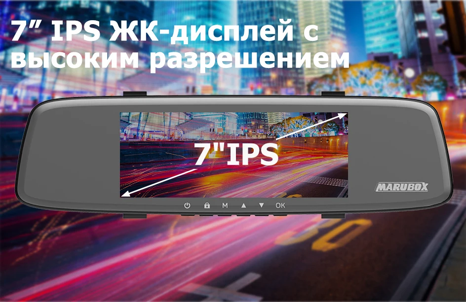 Яркий IPS -дисплей высокого разрешения с диагональю 7” отлично читается под любым углом.В выключенном состоянии на зеркальной поверхности экран регистратора не виден. Это, безусловно, удобно – водителя ничто не отвлекает от дороги. При этом все преимущества большого дисплея остаются в распоряжении водителя – рассмотреть мельчайшие детали в отснятых роликах можно прямо в салоне автомобиля.