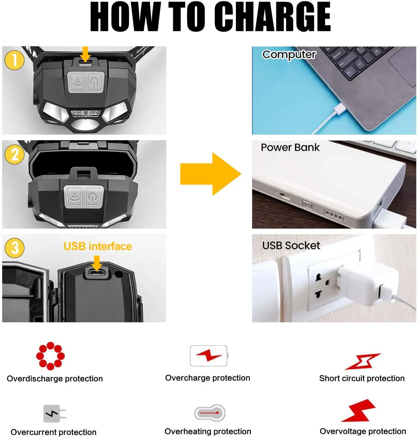 2.The Headlight contain the battery. You Can use the USB charge cable charging for the headlight.