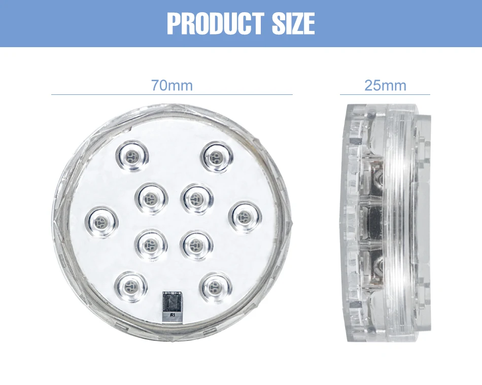 This RGB submersible light is made of transparent material as the lampshade, which will reflects the light perfectly. It will creates more romantic atmosphere at wherever you need, such as pond, fish tank, trailer lights, fountain, waterfall, hot tub, hallway, garage, wedding, event, party as night light indoor and outdoor decoration.