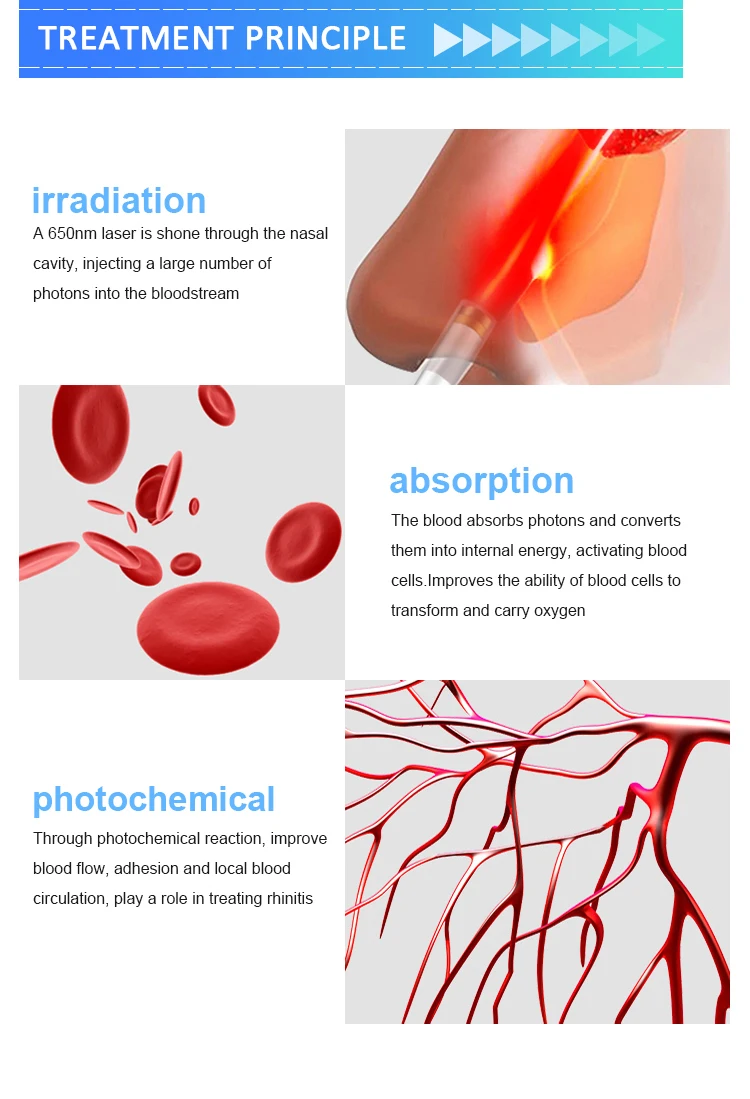 GD02-B инструмент для полупроводниковой обработки ринита разработан на основе передовой лазерной технологии для облучения поврежденных слизистых тканей носа безвредным лазером на 650 нм для активации и ремонта слизистых клеток, скорости местного кровообращения, И помогает поглощать воспалительные экссудации и отеки. Существенно улучшает способность детоксикации, метаболизм, способность анти-аллергии слизистой оболочки носа для лечения различных ринитов.