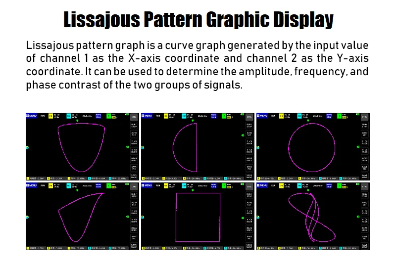 Функция графического дисплея Lissajous может использоваться для определения амплитуды, частоты и фазового контраста двух групп сигналов.