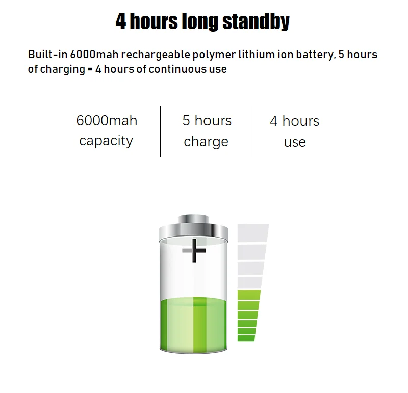 Встроенный перезаряжаемый литиевый аккумулятор емкостью 6000 мАч, полностью заряжен в течение 4 часов непрерывного использования при максимальной яркости экрана.