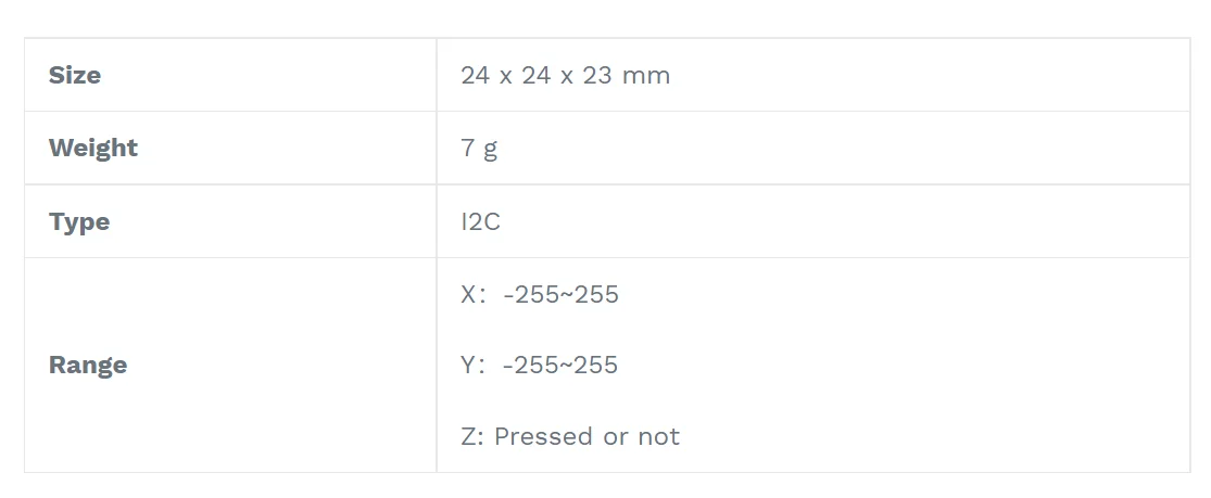 Речь идет о 5-направленное джойстик, которая способна распознавать стоимости x-и y-xis (4 направлениях), а также при нажатии z оси. Это специальный модуль I2C.Отверстия для штифта на задней панели обеспечивают совместимость с пластиковыми строительными блоками.