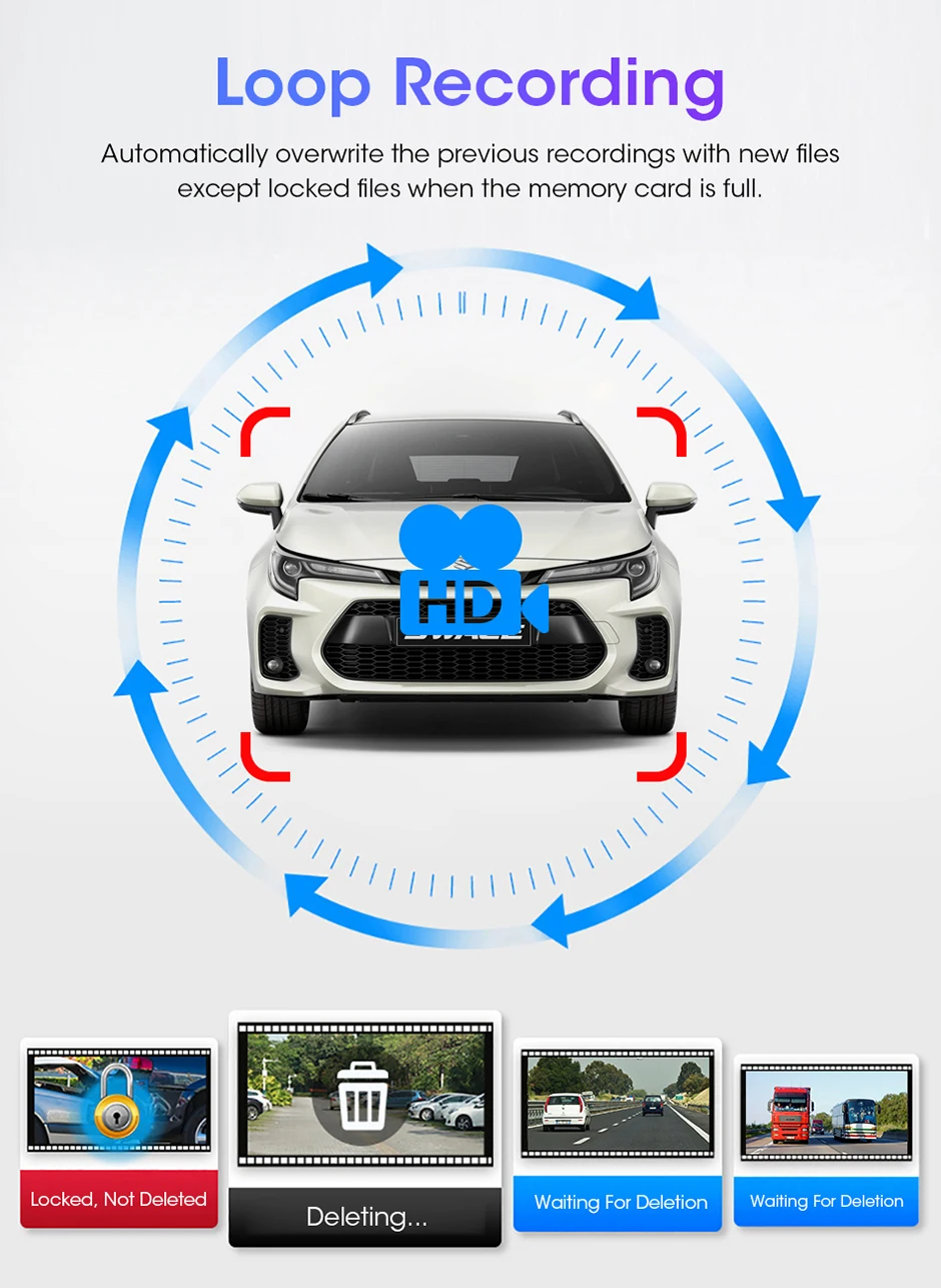 * Запись и воспроизведение видео на парковке, она будет записывать видео парковки в режиме 24/7, когда вы не находитесь внутри автомобиля. Память поддерживает до 256 ГБ. Автоматически перезаписывает предыдущие записи с новыми файлами, когда карта памяти заполнена.