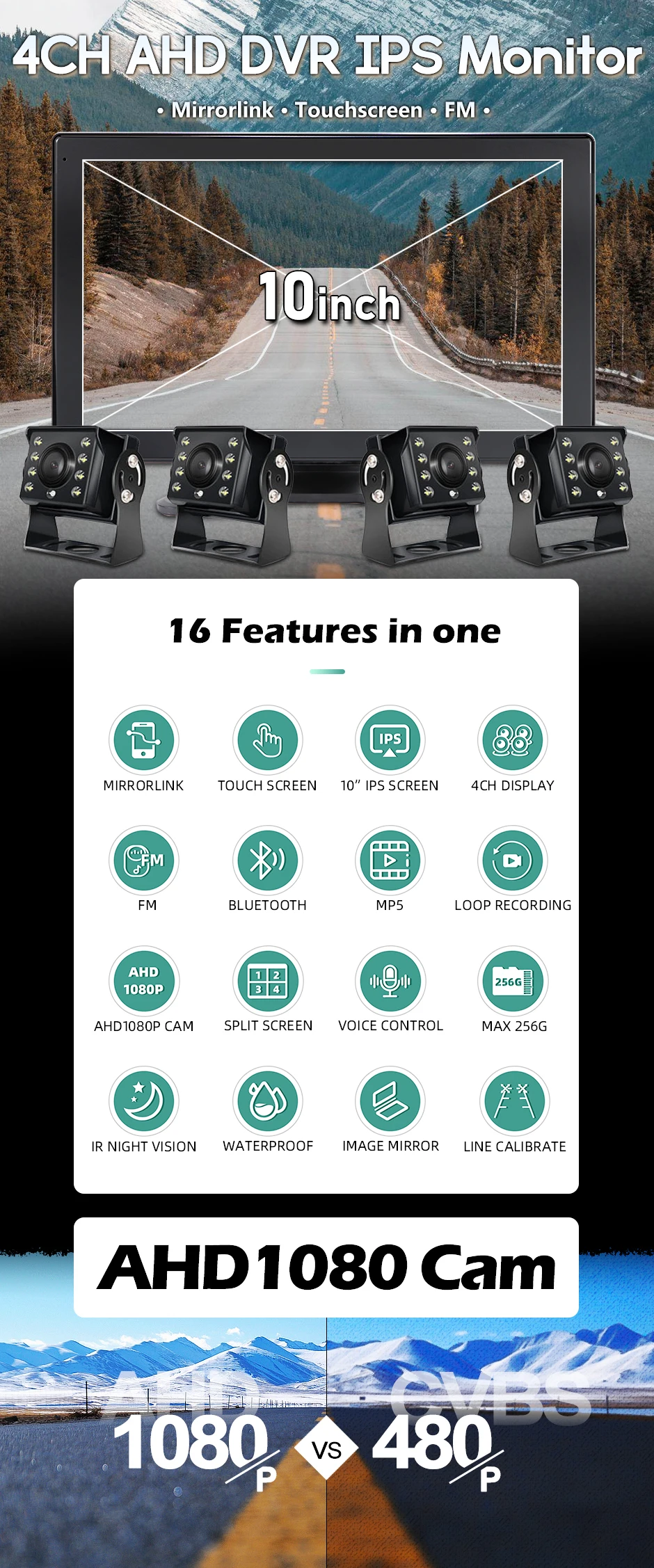 * 10,1 дюймов IPS сенсорный Экран. Высокой четкости 500CD/M2, аналоговая камера высокого разрешения 1920x1080P видео входов. 4 канала Экран Разделенный экран.