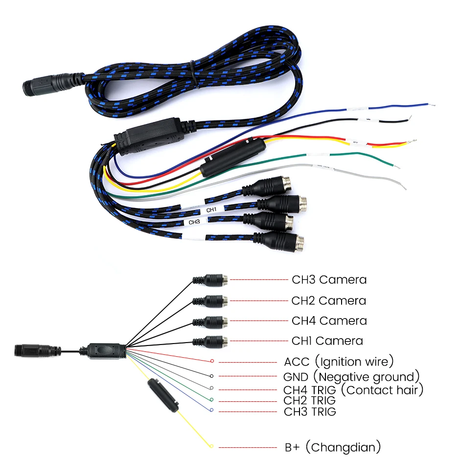 * Авиационный кабель для конкретных грузовиков, по умолчанию 1 шт 15 метров удлиняющий кабель для заднего вида, 3 шт 5 метров удлиняющий кабель для переднего, левого и правого вида. Поддержка для настройки кабеля по вашему желанию.