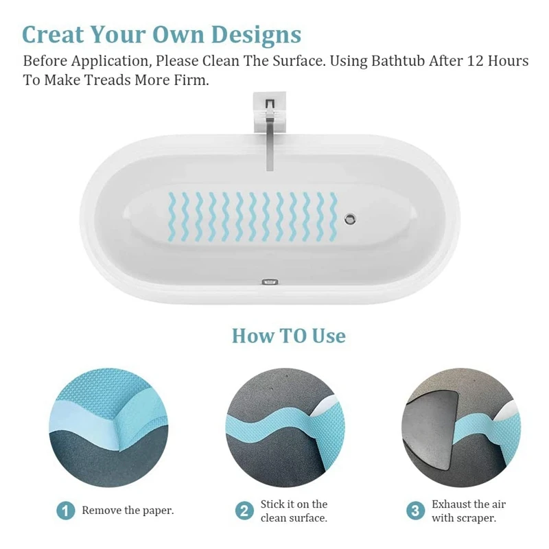 Простота в использовании: пожалуйста, используйте влажную ткань для очистки области, где вы хотите наклеить нескользящую ленту перед нанесением. После высыхания очистите Нескользящие полоски от защитной бумаги. После вставки Аккуратно нажмите на противоскользящую полосу и вытяните воздух скребком, чтобы сделать ее более прочной. И затем, используя ванну через 12 часов, сделайте ступни более стильными и прочными.
