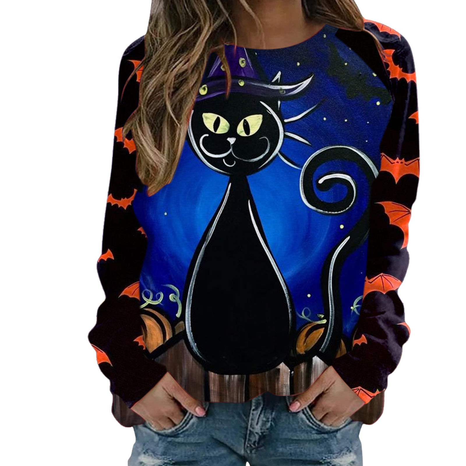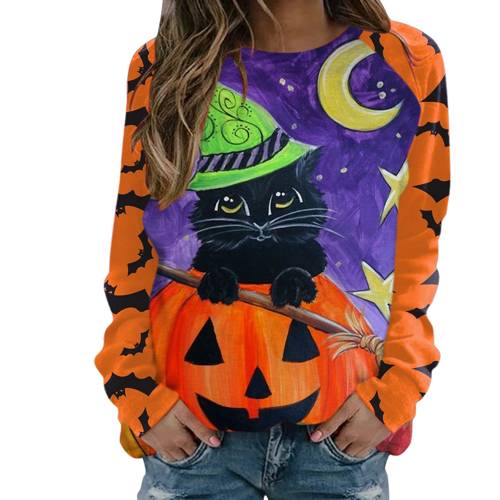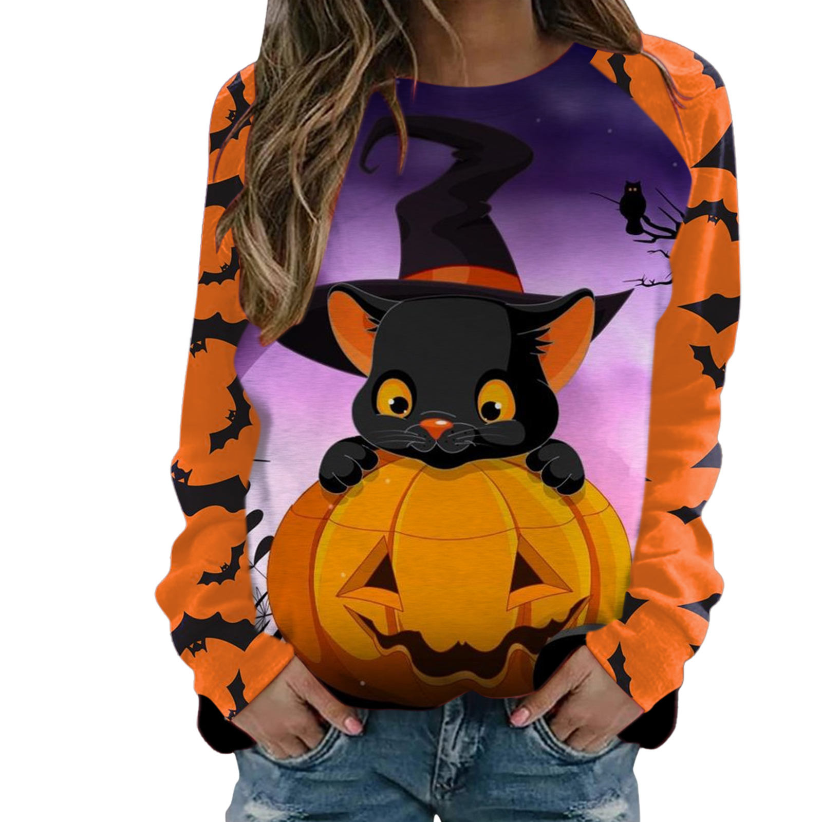 Толстовка на Хеллоуин: Эта толстовка идеально подходит для сезона. Принт с алфавитом, рисунок с котом, длинные рукава, топ с вырезом лодочкой, повседневный стиль. Все эти особенности делают отличный осенний пуловер топом.