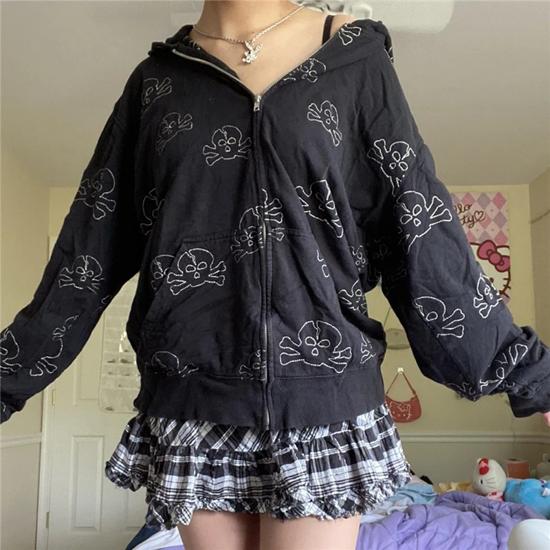 Женская куртка с капюшоном на молнии с принтом черепа; Осенняя Свободная Повседневная Толстовка с длинными рукавами; Дизайн на молнии дополняет стильный образ.