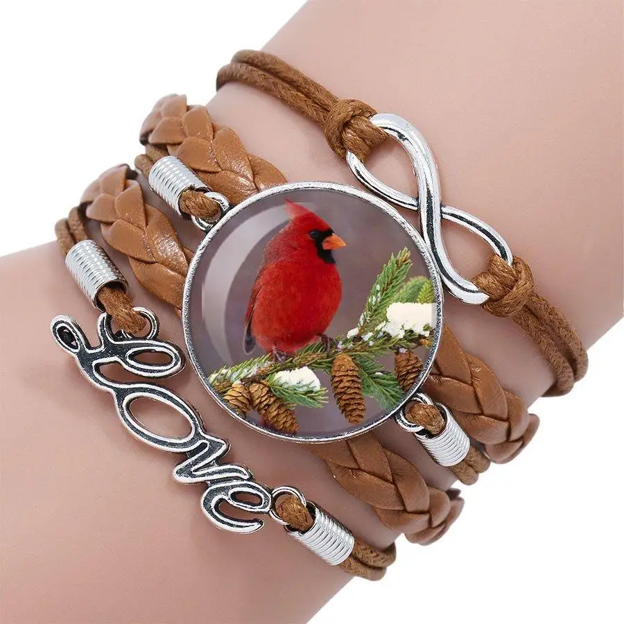 Cardinal Bird, лучшее качество, рождественские ювелирные изделия, стеклянный кабошон, многослойный черный/коричневый кожаный браслет, браслет для женщин, винтажное заявление