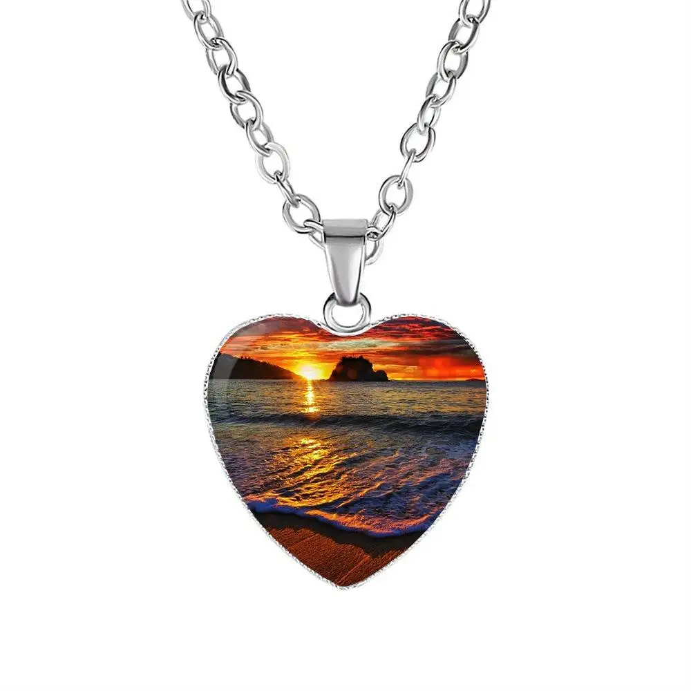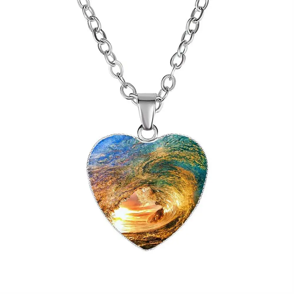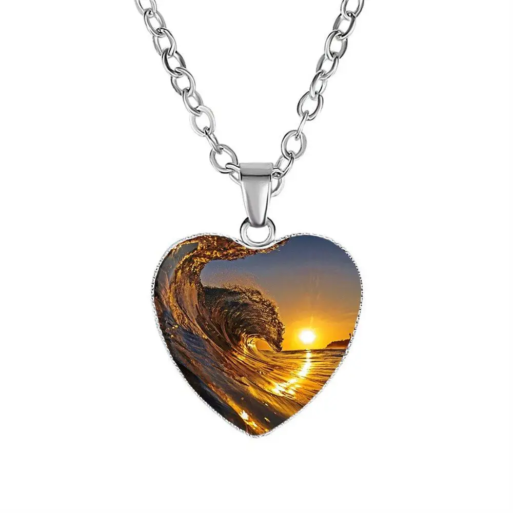 Настоящее ювелирное изделие со стеклом кабошон чокер длинное стальное сердце кулон ожерелье для женщин Свадебные волны и закат