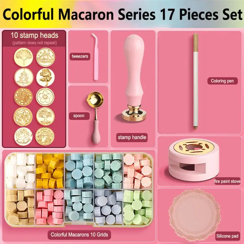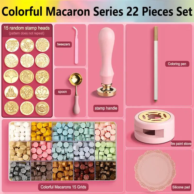 25 pieces of sets (15 seal heads, 1 tweezers, 1 spoon, 1 stirring rod, 1 seal handle, 1 melting furnace, 3 color pens, 1 silicon pads)