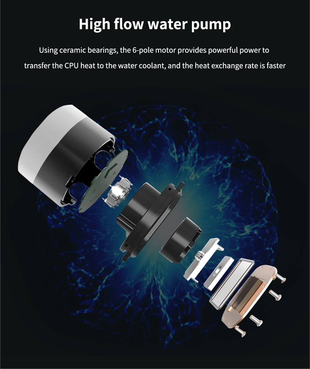 4: высокая скорость потока водяной насос. Используя керамические подшипники, 6-полюсный двигатель обеспечивает мощные мощность передачи Процессор тепло охлаждающей воды и тепла обменный курс быстрее