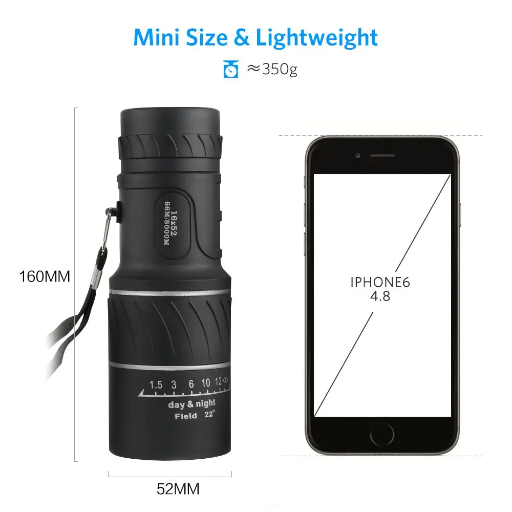 【 16X52 HD MAGNIFICATION】 16x увеличение и 52 мм Диаметр объектива Монокуляр, обеспечивает четкое, яркое изображение и различные поля зрения, идеально подходит для пеших прогулок, скалолазания, наблюдения за птицами, игр с мячом, концертов, путешествовать, смотреть дикую природу и пейзажи.