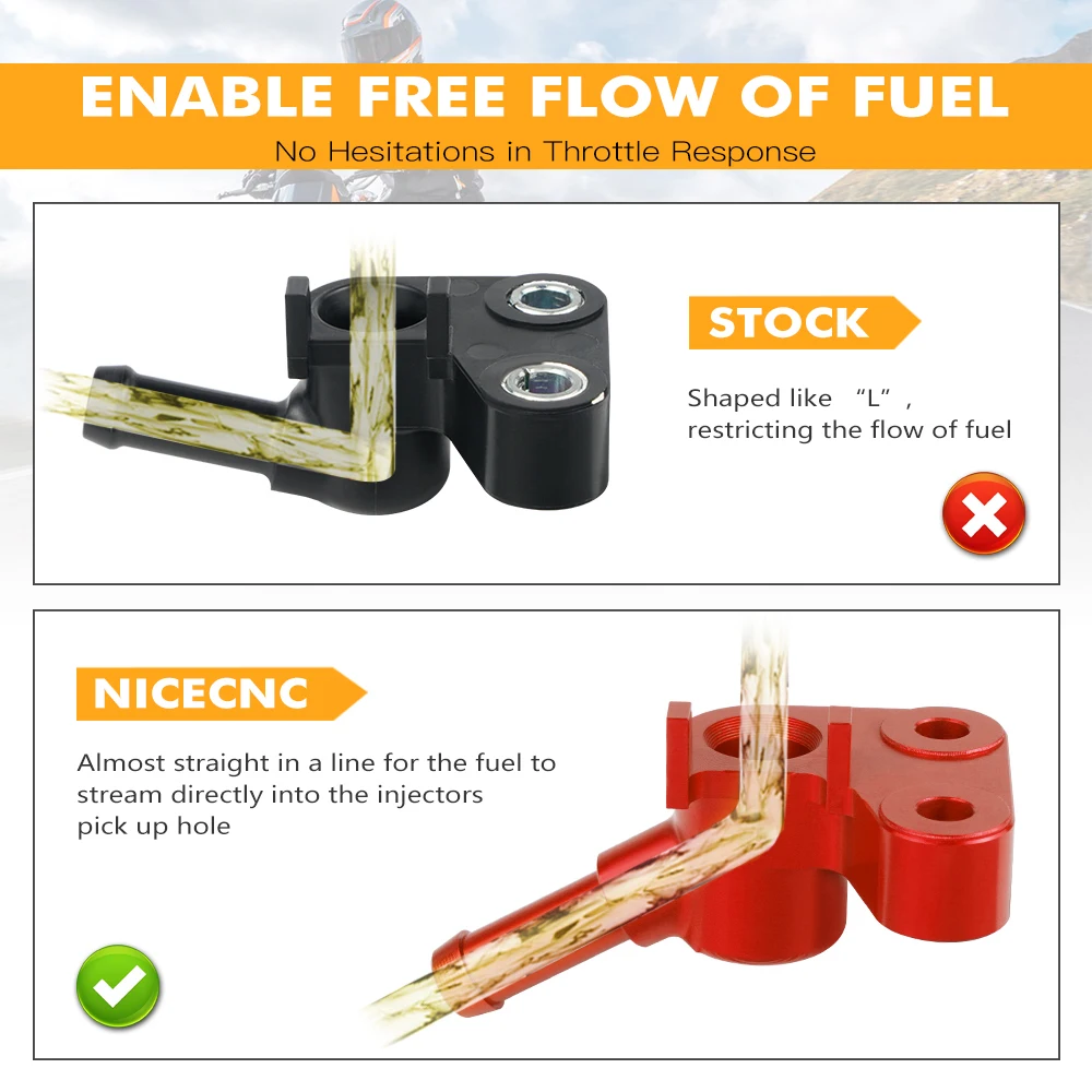 NiceCNC беспрецедентно изменяет угол наклона топливной рампы, делая ее почти прямой линией для подачи топлива прямо в отверстие для забора форсунок. Уже отличное соотношение мощности и веса вашего велосипеда было улучшено для захватывающего ускорения и спринтов. Никаких пламени и остановки.