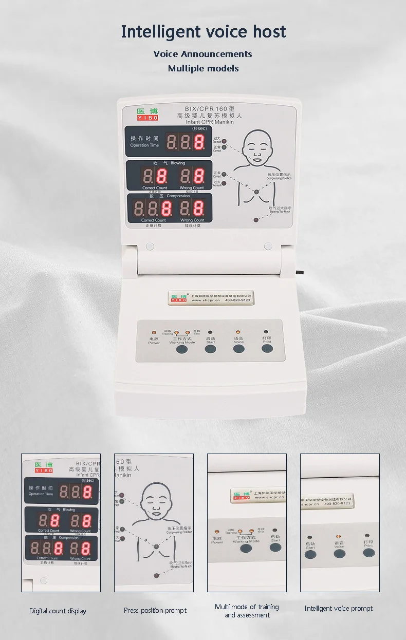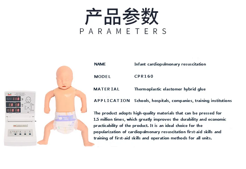 The model is based on the standard of infant CPR, with computer controller. Its design is under the guidance of expert advice, adopt the advantage of similar foreign products. It has realistic appearance, non-smelled materials, real operating characteristics.