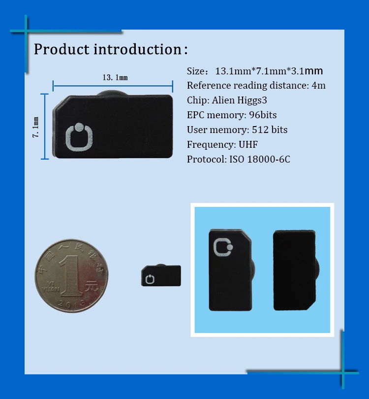 Omni-ID Fit400 UHF RFID Анти-металлическая метка, маленькие 6c пассивные бирки 915 МГц Протокол: EPC Class1 Gen2,ISO18000-6C Частота: UHF,902-928 МГц (можно настроить До 866-868 МГц) Размер: 13,1*7,1*3,1 мм Покрытие: прочная краска Чип: Alien Higgs3 Память EPC: 96 бит Память пользователя: 512 бит Вес: 1,6 г Рабочая температура: от-20 ℃ до + 85 ℃ Класс IP: IP68 Справочном расстояние: 1,6 м