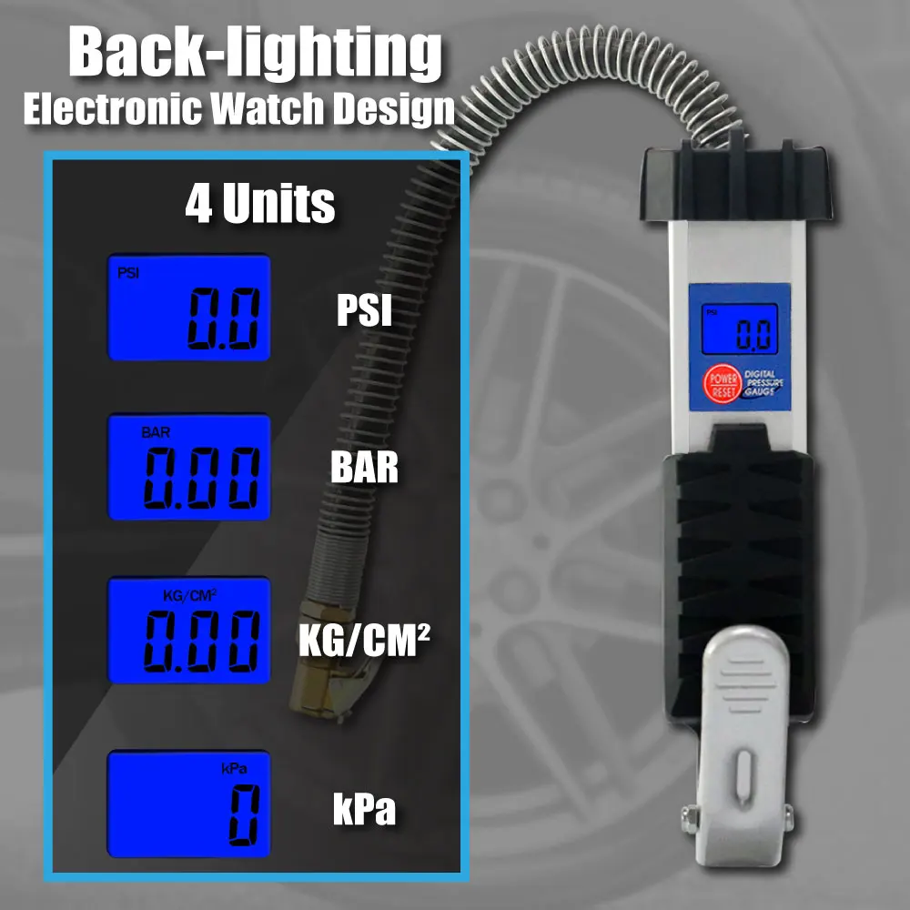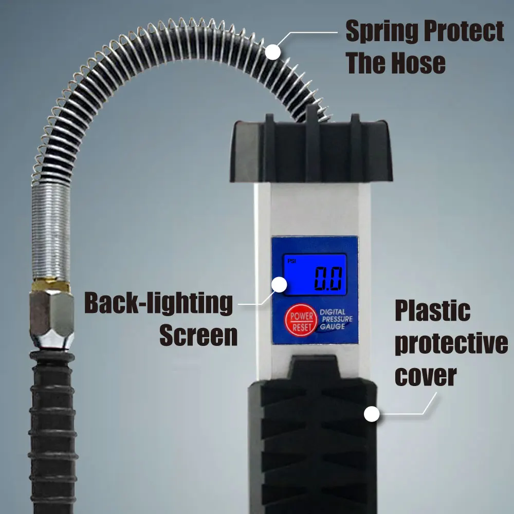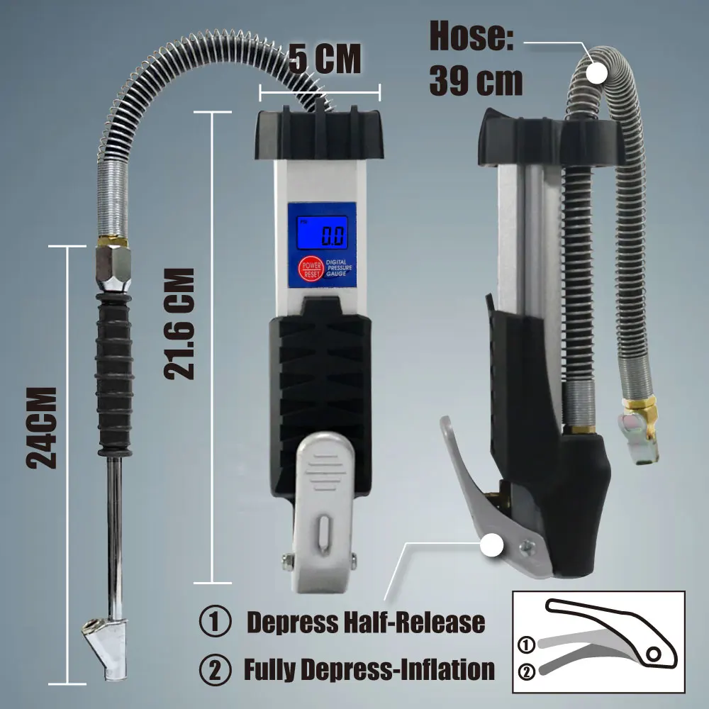(1) надувание давления воздуха (полное сжатие) (2) Сброс давления воздуха (сжатие наполовину) (3) защита от ударов (4) управление одной рукой (5) электронные часы с подсветкой (6) двухголовое соединение (7) Автоматическое отключение (8) Сделано в Тайване