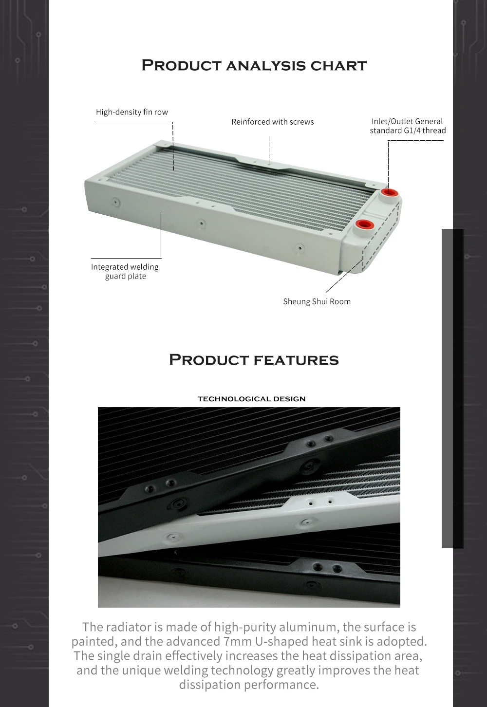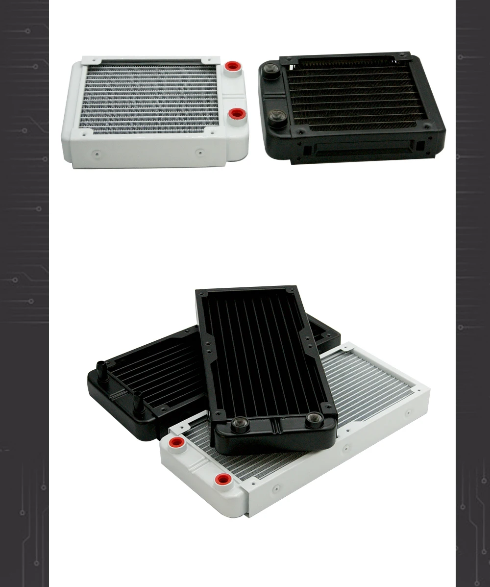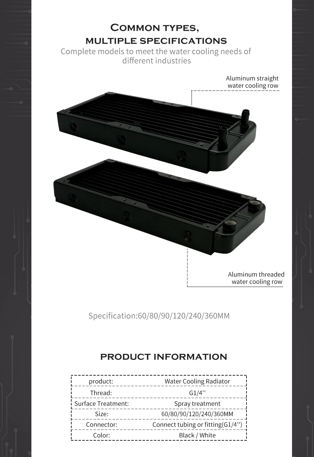 Тепла строки из алюминиевого материала, с помощью 4,5 мм Высота волны в форме латинской буквы U нагревательная лента, высокая плотность s-образный степлер охлаждающий ремень, такая конструкция эффективно обеспечивает более эффективное охлаждение, повышение эффективности теплообмена. Тепловой ряд 60 мм, 80 мм, 90 мм, 120 мм, 240 мм спецификации, пользователь может нагревать свои машины от линии, чтобы выбрать соответствующий ряд теплообменников.Боковая спрей, гладкая и имеет текстуру, роскошный, элегантный, черный дизайн дает более зрелое ощущение. Формируя технологию сварки, один ряд охлаждения, 18 циклов водного пути, Sheung Shui дизайн интерьера водонепроницаемого отсека в среднем устройстве для предотвращения струны воды, ваша аппаратная безопасность более безопасна.Тип продукта: CPU-60XМатериал: АлюминийПодключение: G1/4 Резьбовая арматура или 7-8 мм (60,80,90 радиатора) 9,5-10 мм (120240 решетка радиатора) трубки опциональноПодходящая манера 2: D9.5мм прямая пагодаОбработка поверхности: СпрейВодные каналы: 6-10 шт.Технология продукта: Применение Расширенный 4,5 мм типа U нагревательная лента, с переключением между дальним и дренажные каналы для эффективного увеличения зоны охлаждения, уникальная технология сварки, что значительно улучшает тепловые характеристики.Применение: Для систем водяного охлаждения ПК или другого электронного оборудования и различных промышленных чипов охлажденияСписок доставки1 х Алюминиевый рандиатор