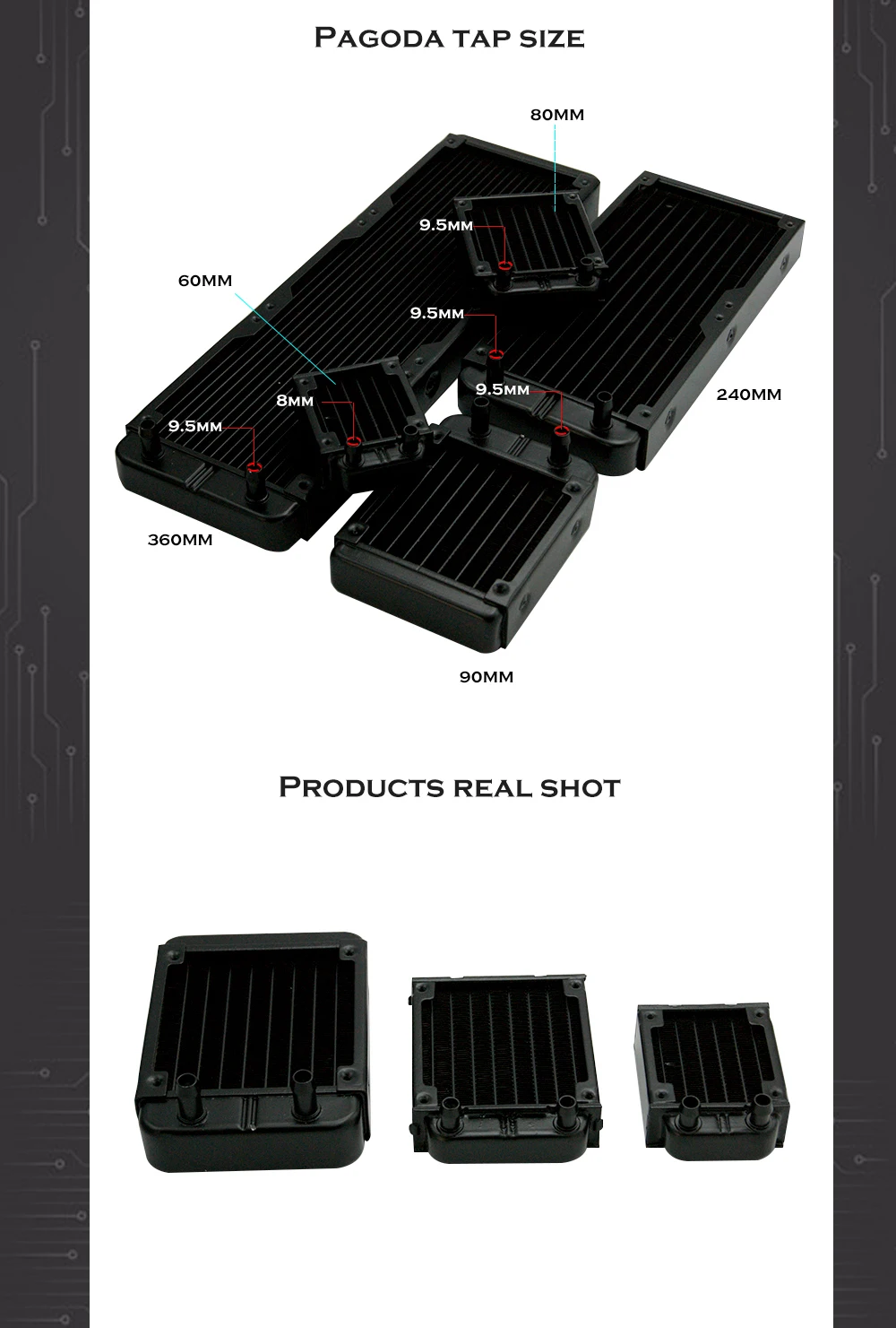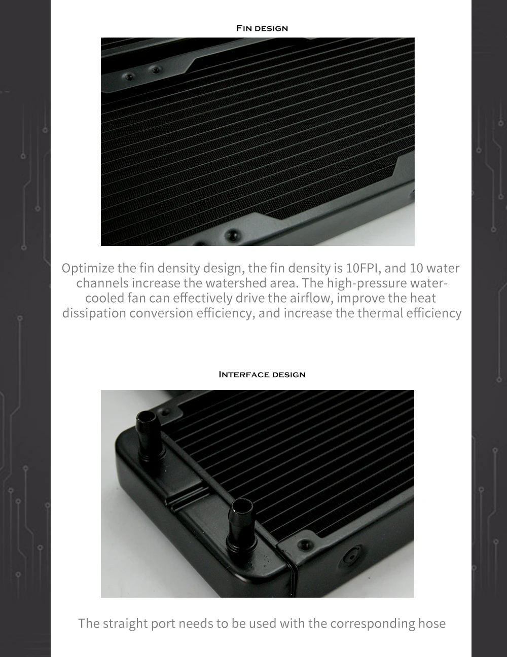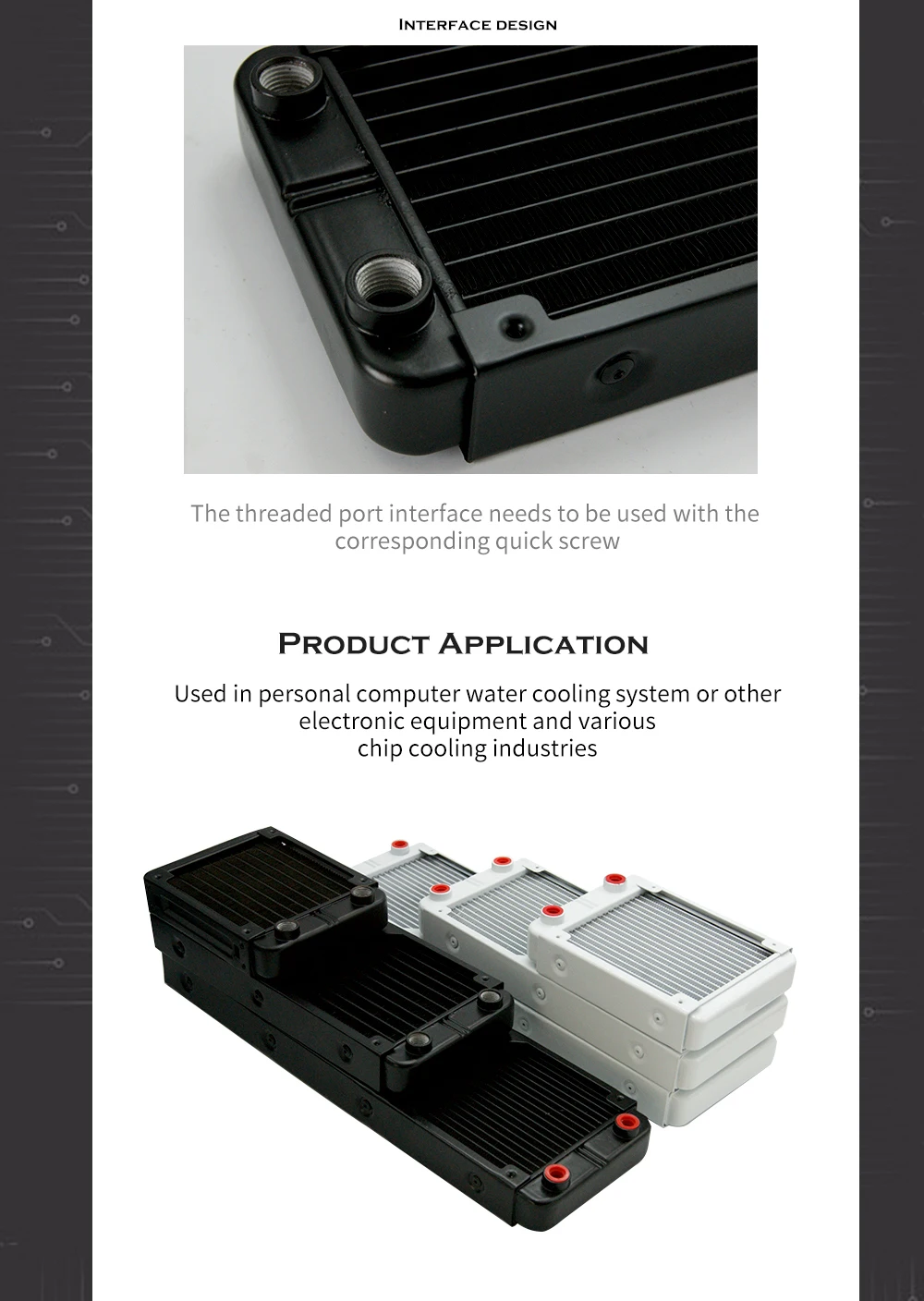 Тепла строки из алюминиевого материала, с помощью 4,5 мм Высота волны в форме латинской буквы U нагревательная лента, высокая плотность s-образный степлер охлаждающий ремень, такая конструкция эффективно обеспечивает более эффективное охлаждение, повышение эффективности теплообмена. Тепловой ряд 60 мм, 80 мм, 90 мм, 120 мм, 240 мм спецификации, пользователь может нагревать свои машины от линии, чтобы выбрать соответствующий ряд теплообменников.Боковая спрей, гладкая и имеет текстуру, роскошный, элегантный, черный дизайн дает более зрелое ощущение. Формируя технологию сварки, один ряд охлаждения, 18 циклов водного пути, Sheung Shui дизайн интерьера водонепроницаемого отсека в среднем устройстве для предотвращения струны воды, ваша аппаратная безопасность более безопасна.Тип продукта: CPU-60XМатериал: АлюминийПодключение: G1/4 Резьбовая арматура или 7-8 мм (60,80,90 радиатора) 9,5-10 мм (120240 решетка радиатора) трубки опциональноПодходящая манера 2: D9.5мм прямая пагодаОбработка поверхности: СпрейВодные каналы: 6-10 шт.Технология продукта: Применение Расширенный 4,5 мм типа U нагревательная лента, с переключением между дальним и дренажные каналы для эффективного увеличения зоны охлаждения, уникальная технология сварки, что значительно улучшает тепловые характеристики.Применение: Для систем водяного охлаждения ПК или другого электронного оборудования и различных промышленных чипов охлажденияСписок доставки1 х Алюминиевый рандиатор