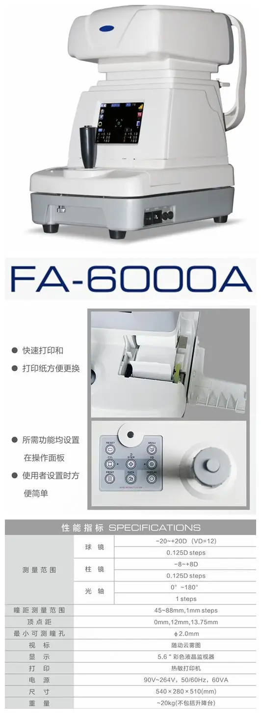 Простое управление одной рукой: все операции, включая вверх, вправо, влево, вперед и назад, можно легко управлять одной рукой через контрольную палку. Диапазон измерений Сферическая: -20 ~ + 20D (VD = 12) 0,125 Dsteps Цилиндр: -8 ~ + 8D 0.12D/0.25D шаги Ось: 0 ~ 180 °,1 ° шаги Расстояние зрачка: 45 ~ 85 мм, 1 мм шаги Расстояние вершины: 0 мм, 12 мм, 13,75 мм Минимальный размер зрачка: ø2.0мм Диаграмма: изображение автомобильного тумана Дисплей: 7 "цветной ЖК-экран