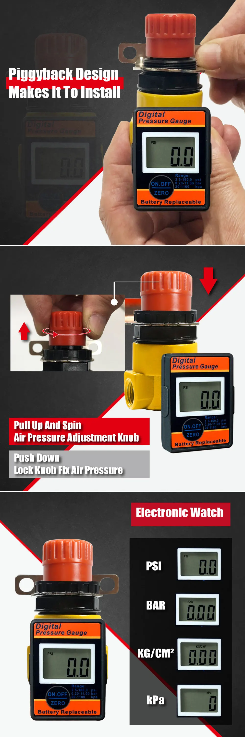 (1) три блока давления воздуха. (2) ЖК-дисплей и легко читается. (3) Автоматическое выключение. (4) Ударопрочный корпус. (5) сделано в Тайване. (6) для воздушного компрессора, воздушной системы, встроенных воздушных инструментов (7) цифровой регулятор давления воздуха LEMATEC Сопротивляется любым типам химических веществ и растворителей.