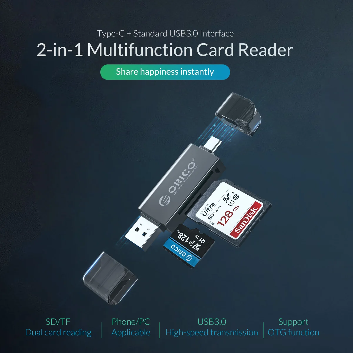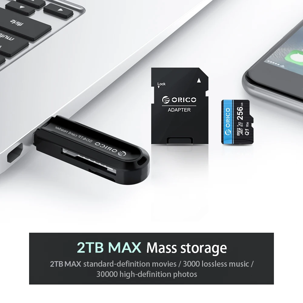 Материал: АБС-пластик Поддержка слота для карт серии TF / SD/SDHC/SDXC, высокая емкость 2 ТБ и чрезвычайно быстрая передача Функция: без диска, Plug and Play, поддержка hot swap Поддержка функции OTG (мобильные телефоны и другие электронные устройства должны поддерживать функцию OTG)
