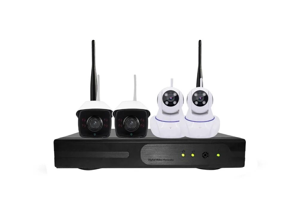 Посылка включает в себя 1 шт. * 4CH 720 P wifi NVR 4 шт. * 720 P wifi IP cameres 4 шт. * Адаптер для ip-камеры 1 шт. * Адаптер для NVR 1 шт. * ИК-мышь К сведению:Беспроводная система не означает, что вы можете использовать систему без каких-либо кабелей. Вы должны подключить их к адаптерам питания для подачи питания к камерам и NVR.