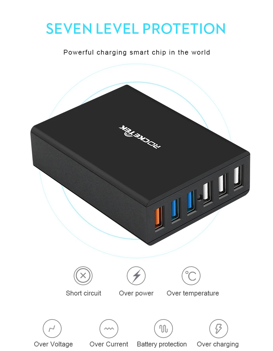 A: Общая мощность, 6 портов для зарядки продукта, необходимого для выделения максимального тока для достижения максимально быстрого управления зарядкой, эффективность - это жизнь