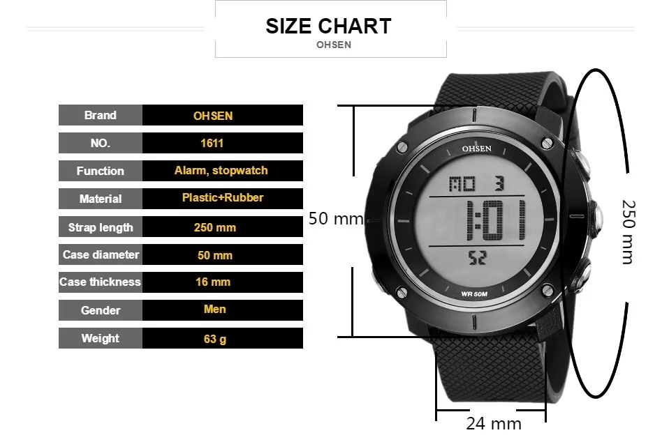 Case Diameter : 50 mm Case thickness : 16 mm Band length : 250 mm (Band can be adjusted) Band width : 24 mm