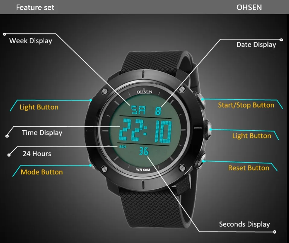 Digital: Hour, minute, second, pm, month, date, day 12/24 hour format Alarm and hourly chime function Special design with the chronograph (stopwatch) at 0.01 second increment The waterproof depth is up to 50M (Don't press any button in the water) Additional LCD back light function to display the time clearly in darkness Shock Resistant, perfect for both outdoor or indoor sports, such as running, climbing,fishing, ect