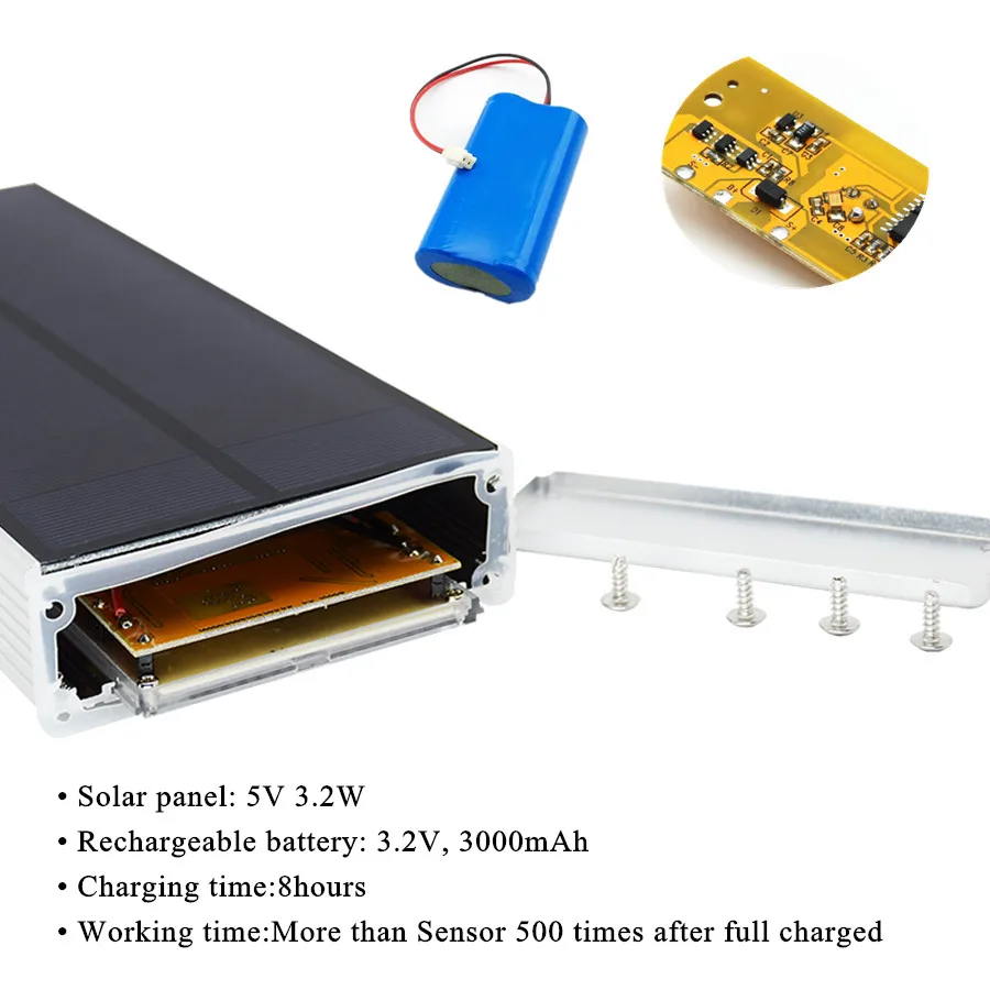 Солнечная панель: 5В 3,2 Вт Ток подзарядки: 640 мАч Светодиодный светильник: 48 Светодиодный Яркость: около 800-1000 лм Водонепроницаемость: IP65 Батарея: литиевая батарея (3,2 в, 3000 мАч) Индукционный режим: индукция микроволнового радара Время зарядки: 8 часов Материал: Поликарбонат + УФ Удалите аккумулятор, когда изделие не используется в течение длительного времени. Срок службы: более 5 лет Посылка: солнечный светильник X 1; Аксессуары X 1 комплект; Руководство пользователя на английском языке X 1
