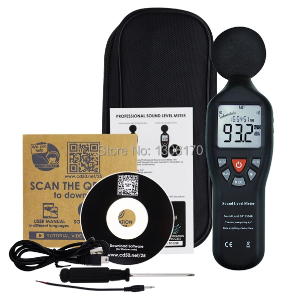 Этот Звуковой Измеритель может считываться между30dB ~ 130dBИ записывает данные на ПК с помощью совместимого программного обеспечения (входит в комплект).