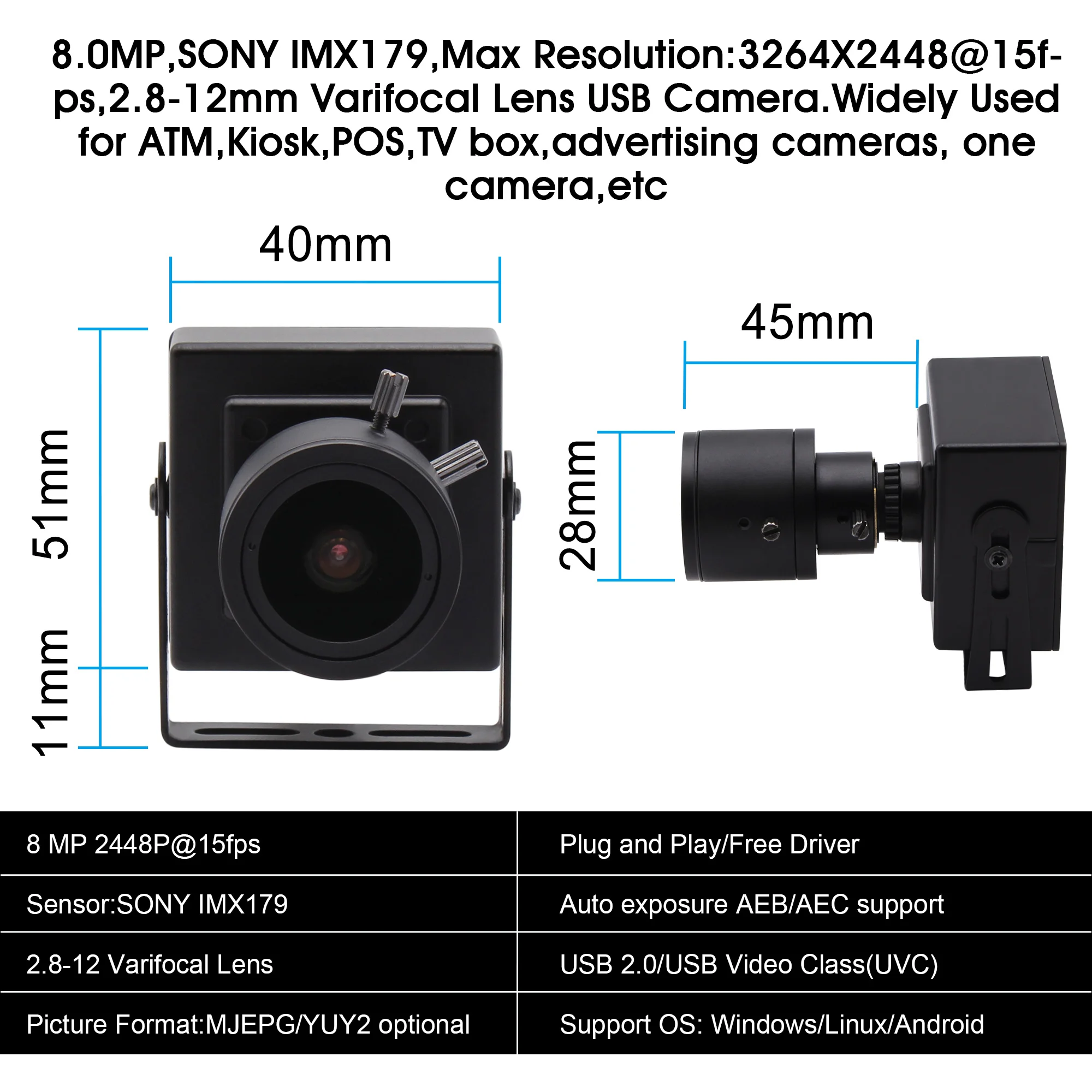 * 1/3.2 "SonyIMX179sensor для высокого качества изображения и низкое энергопотребление