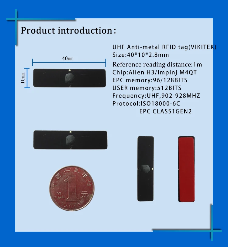 UHF RFID Анти-металлическая бирка PCB 6c пассивная бирка 915 МГц Протокол: EPC класс 1 Gen2, ISO18000-6C Частота: UHF, 902-928 МГц Размер: 40*10*2,8 мм Материал: PCB Чип: Alien Higgs3/Impinj Monza4QT Память EPC: 96 бит/128 бит Память пользователя: 512 бит Вес: 2,31 г Рабочая температура: от-30 ℃ до + 85 ℃ IP Рейтинг: IP67 Приблизительное расстояние считывания: 1 м
