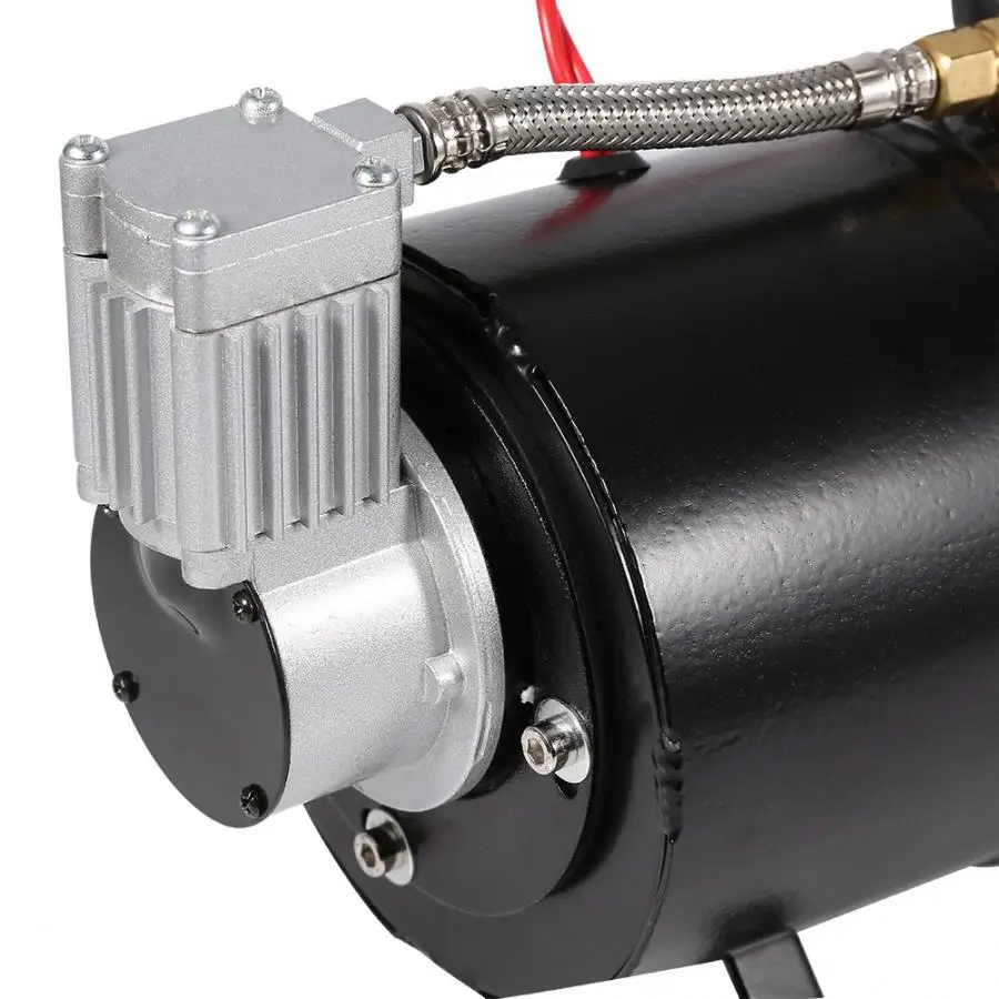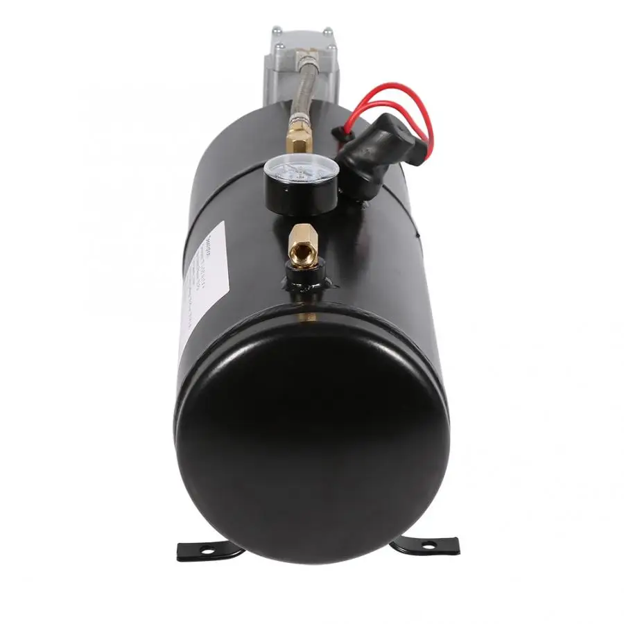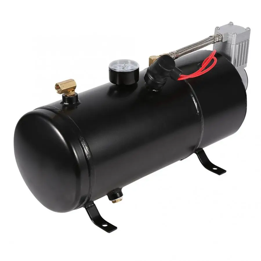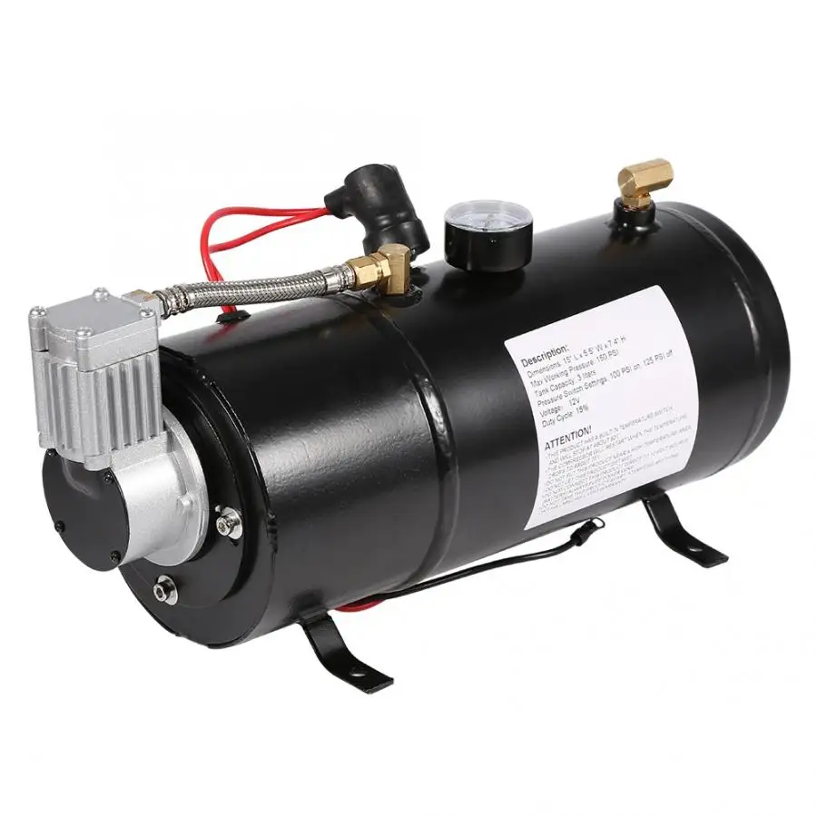 ЭтоВоздушный компрессор стоитПредназначен для пневматических Рожков высокого давления, требующих бортовой системы подачи воздуха. И он имеет давление 150 PSI и объем воздуха 3 литра.ВВоздушный бак изготовлен из металла с латунным фитингом и алюминиевым корпусом, поэтому он является прочным в использовании и обладает надежным качеством.
