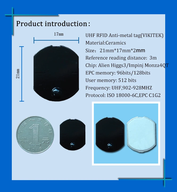 UHF RFID Анти-металл тег керамика Малый 6c пассивные теги 915 МГц Протокол: EPC класс 1 Gen2, ISO18000-6C Частота: UHF, 902-928 МГц (можно настроить до 865-868 МГц) Размер: 21*17*2 мм Материал: керамика Чип: Alien Higgs3/Impinj Monza4QT Память EPC: 96 бит/128 бит Память пользователя: 512 бит Вес: 3,21 г Рабочая температура: от-30 ℃ до + 85 ℃ IP Рейтинг: IP65 Приблизительное расстояние чтения: 3 м