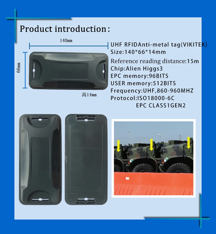 UHF RFID Анти-металлическая метка ABS 6c пассивная метка 915 МГц Протокол: EPC класс 1 Gen2, ISO18000-6C Частота: UHF, 860-960 МГц Размер: 140*66*14 мм Материал: АБС-пластик Чип: Alien Higgs3 Память EPC: 96 бит Память пользователя: 512 бит Вес: 79 г Рабочая температура: от-40 ℃ до + 65 ℃ IP Рейтинг: IP68 Приблизительное расстояние считывания: 15 м