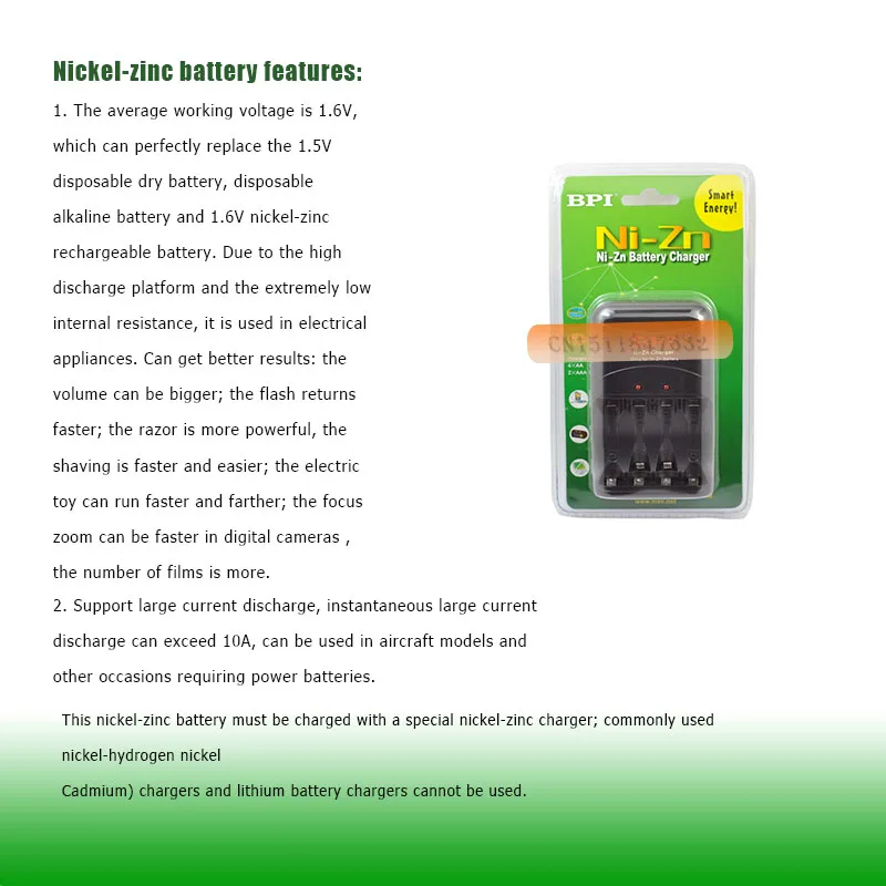 Быстрое зарядное устройство NiZn:Характеристики:Вход: 100-240 В переменного тока, Гц Международная совместимостьВыход: DC 4 x (1,6 в-ма) AA / 2 x AAA РазмерОсновные характеристики:Заряжает 1-4 AA/1-2 AAA Ni-Zn батареиЗащита от обратной полярностиCC-CV контрольСветодиодный указывают на состояние зарядки аккумулятораНизкий ток утечки батареиФункция восстановления низкого напряженияСветодиодный индикатор:Легко контролировать светодиодный ные индикаторы зарядаГорит красный светодиодный: идет зарядка
